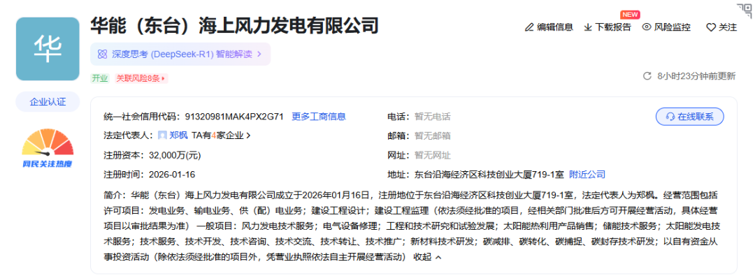 爱企查显示,1月16日,华能(东台)海上风力发电有限公司成立,注册资本达3.2亿元。该公司经营范围包括发电业务、输电业务、供(配)电业务;风力发电技术服务;电气设备修理;储能技术服务;太阳能发电技术服务;碳减排、碳转化、碳捕捉、碳封存技术研发等。