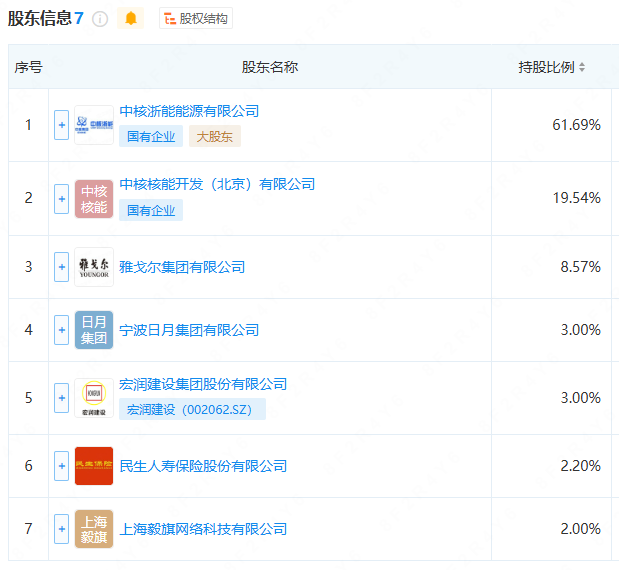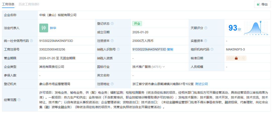 天眼查工商信息显示,1月20日,中核(象山)核能有限公司成立,法定代表人为钟华,注册资本2.5亿人民币,经营范围含发电业务、输电业务、供(配)电业务,辐射监测,检验检测服务,热力生产和供应,业务培训,发电技术服务,以自有资金从事投资活动等。股东信息显示,该公司由中国核电旗下中核浙能能源有限公司、宏润建设(002062)、雅戈尔集团有限公司、阿里巴巴旗下上海毅旗网络科技有限公司等共同持股。