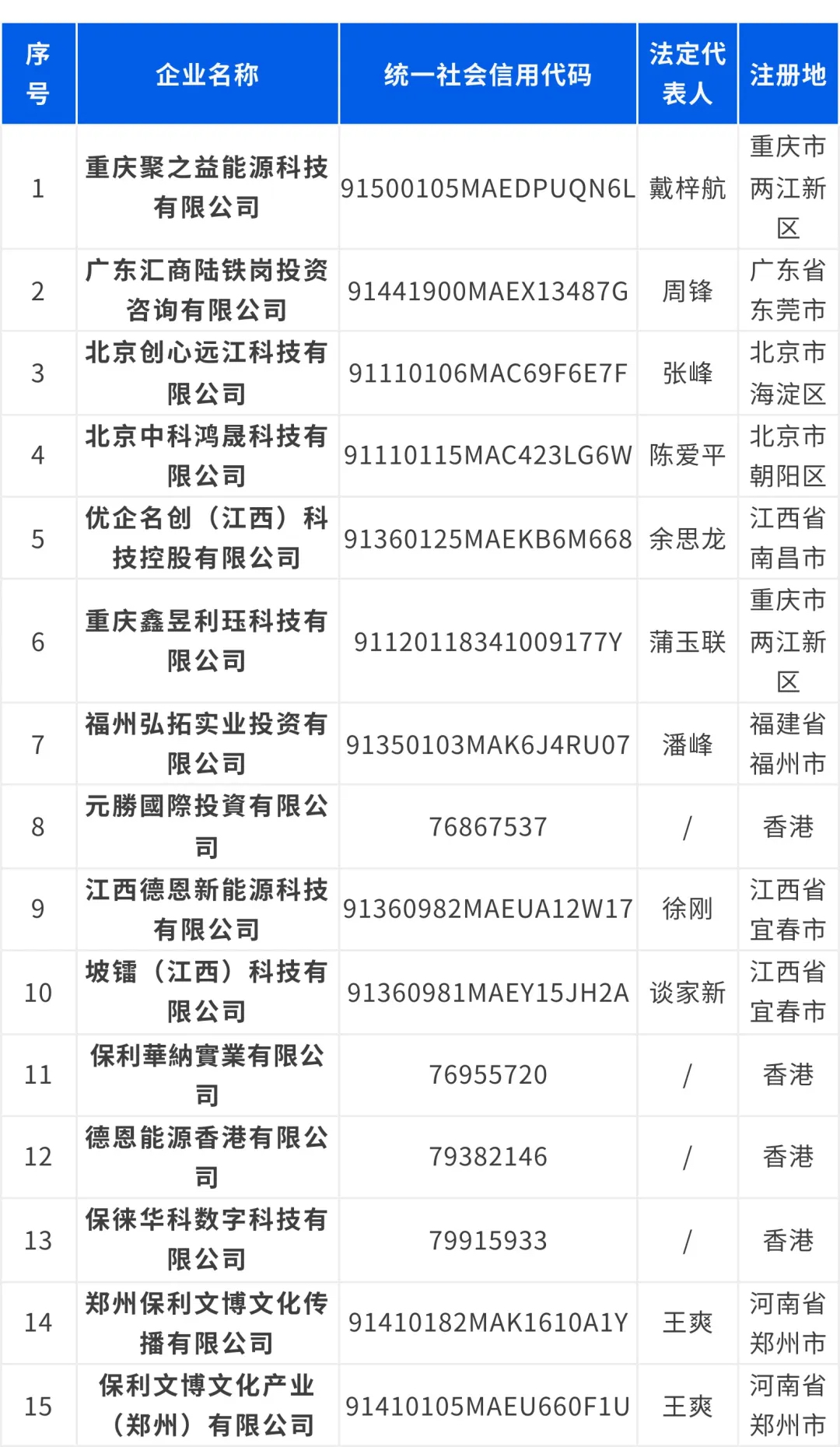 此外,保利集团称,重庆聚之益能源科技有限公司、广东汇商陆铁岗投资咨询有限公司、北京创心远江科技有限公司等公司系通过伪造印章、注册材料,将企业注册为保利集团下属公司的假冒国企,实际与保利集团及所属公司无任何隶属与股权关系,也不存在任何投资、合作、业务等关系。(吴家驹)