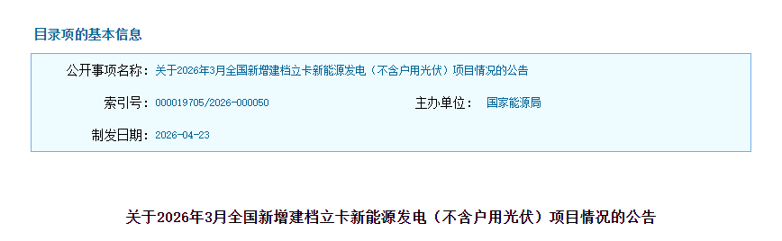 关于2026年3月全国新增建档立卡新能源发电(不含户用光伏)项目情况的公告
