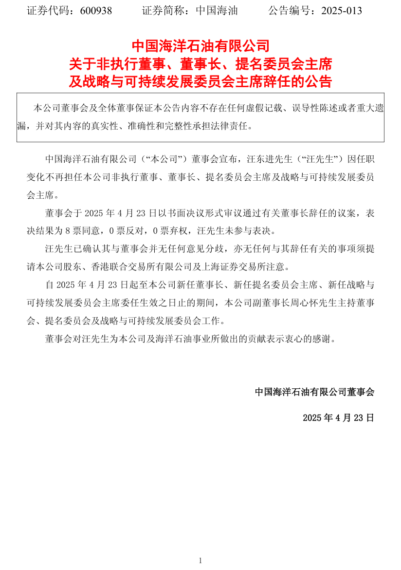 4月23日,中国海油公告,汪东进因任职变化不再担任公司非执行董事、董事长、提名委员会主席及战略与可持续发展委员会主席。