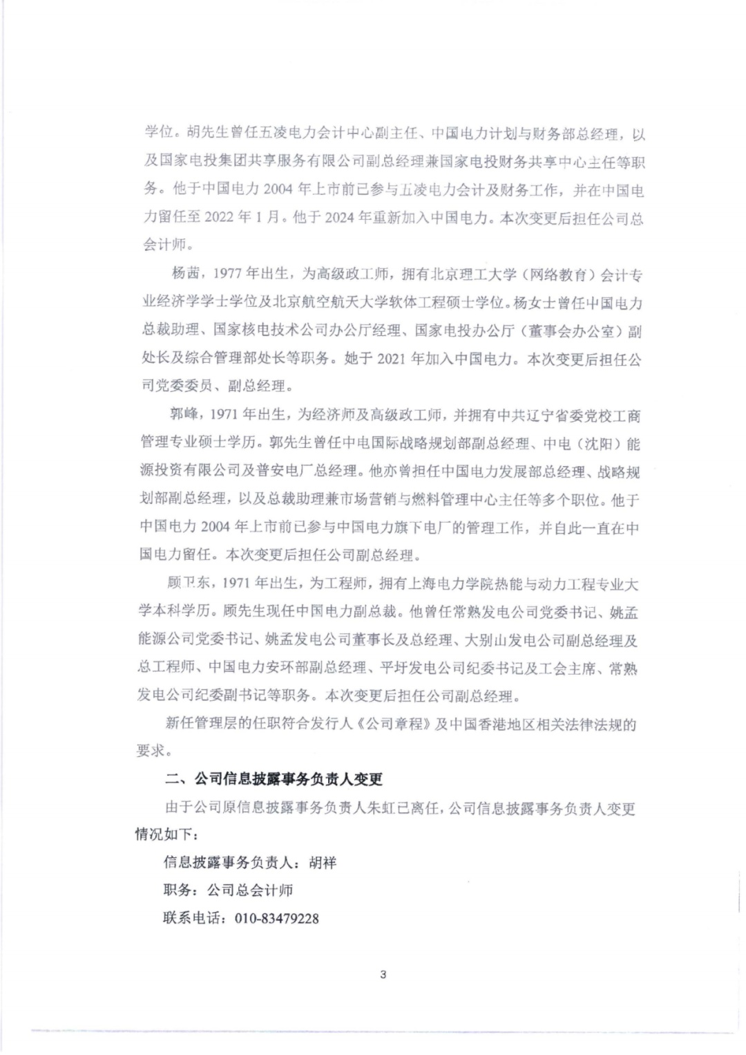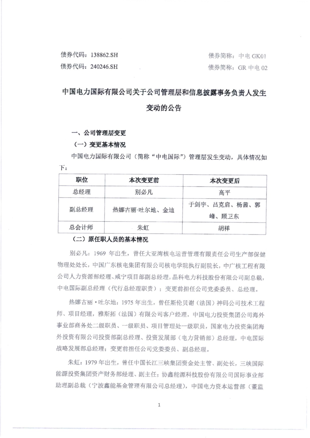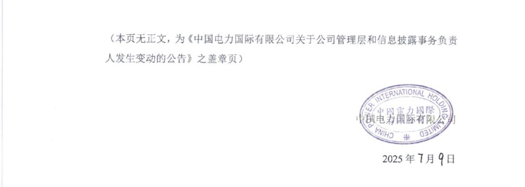 7月9日,中国电力国际有限公司(简称:中电国际)发布公告,中电国际管理层发生变动,高平新任中电国际总经理,于剑宇、吕克启、杨茜、郭峰、顾卫东新任中电国际副总经理,胡祥新任中电国际总会计师。