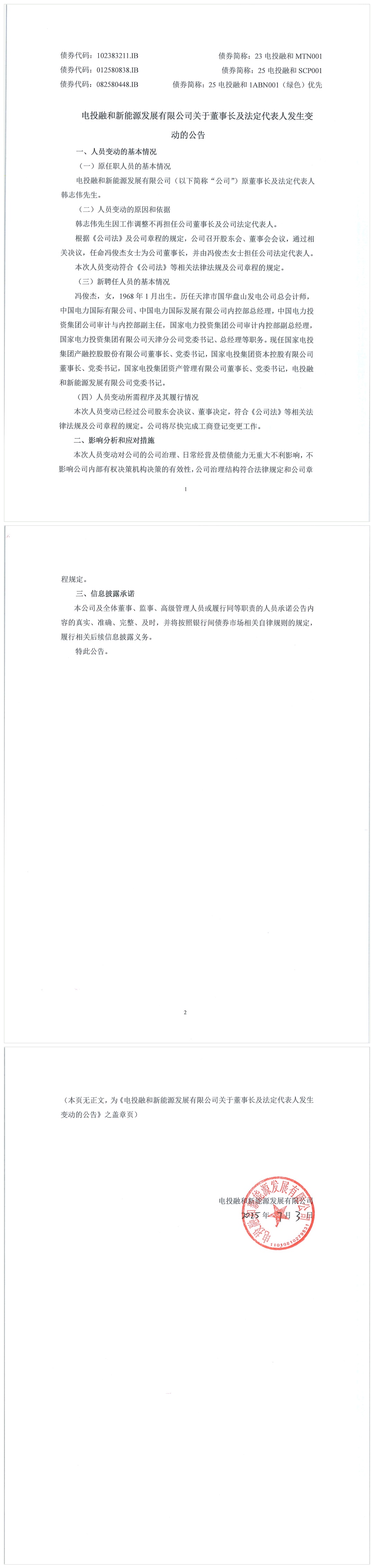 电投融和新能源发展有限公司发布公告称,韩志伟先生因工作调整不再担任公司董事长及公司法定代表人。
