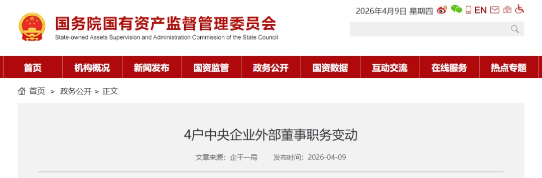 国务院国资委网站4月9日消息,4户中央企业外部董事职务变动。