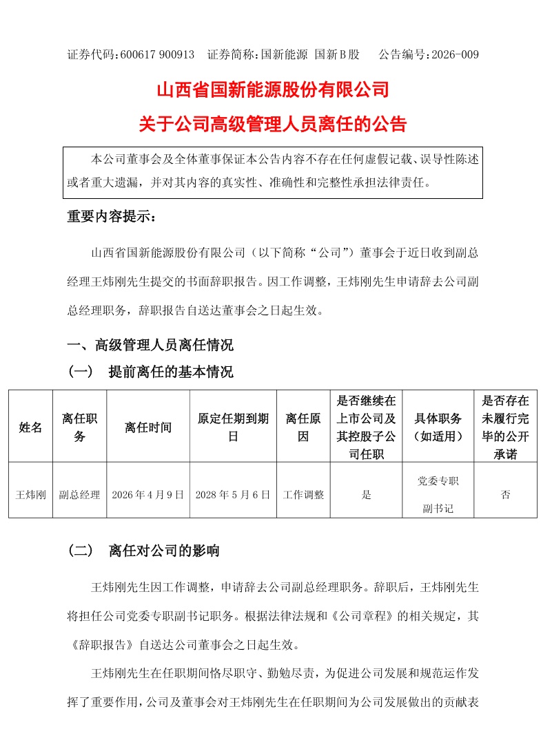 4月9日,国新能源发布公告称,公司董事会于近日收到副总经理王炜刚先生提交的书面辞职报告。因工作调整,王炜刚先生申请辞去公司副总经理职务。辞职后,王炜刚先生将担任公司党委专职副书记职务。