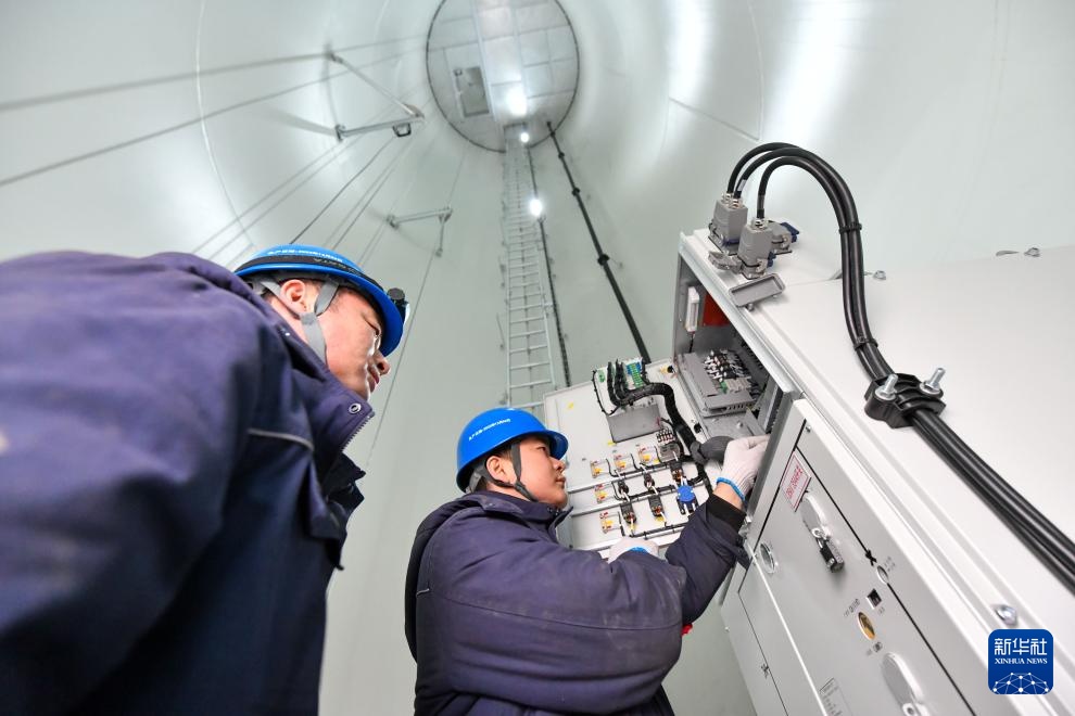 3月28日,在依兰鸡冠山风电场四期项目的一处风电机组机舱内,工作人员在进行风机送电操作。