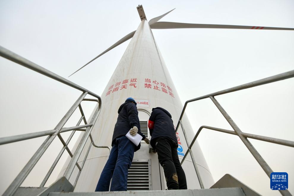 3月28日,工作人员准备进入依兰鸡冠山风电场四期项目的一处风电机组机舱内进行风机送电操作。