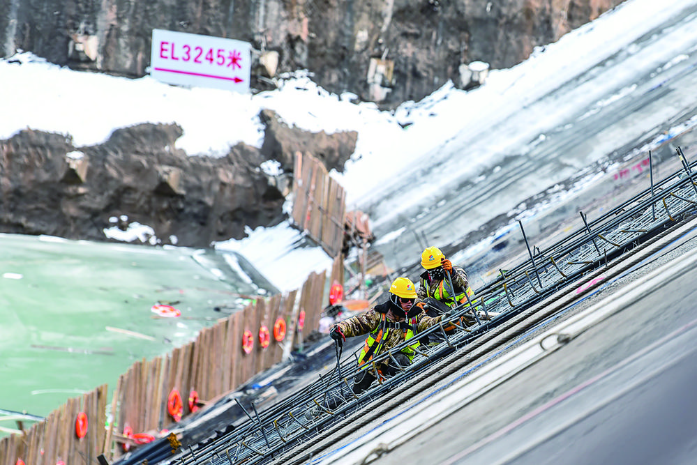 3月24日,玛尔挡水电站施工人员正冒雪绑扎钢筋,为四月一日大坝三期面板开仓浇筑做好准备工作 国家能源集团供图