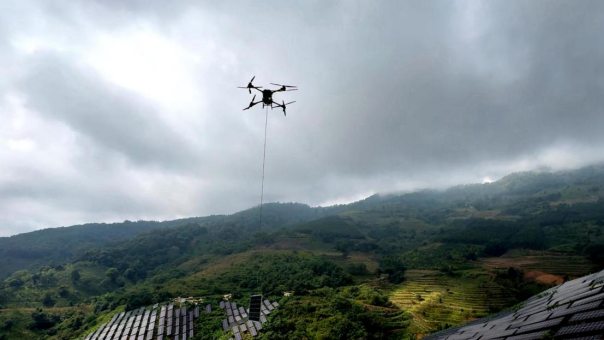 物资运输曾是建设过程中一大难关。华能乌沙河下寨光伏项目进场道路原本都是乡村小路,尽管项目团队对道路进行了拓宽修缮,但腹地仍有很多地方无路可走。为此,项目团队可谓是“骡马运输队+工业级无人机+山地溜槽”轮番上阵“接力”。