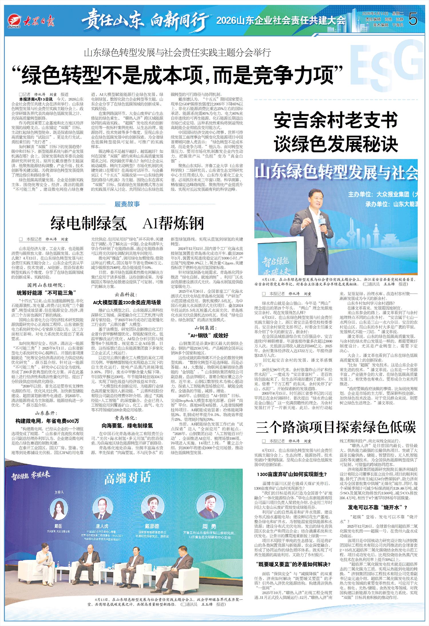 4月13日,2026山东企业社会责任共建大会在济南举行。山东绿色转型发展与社会责任实践主题分会上,政企学研媒各界代表共商绿色低碳发展之计,共探高质量转型新路。