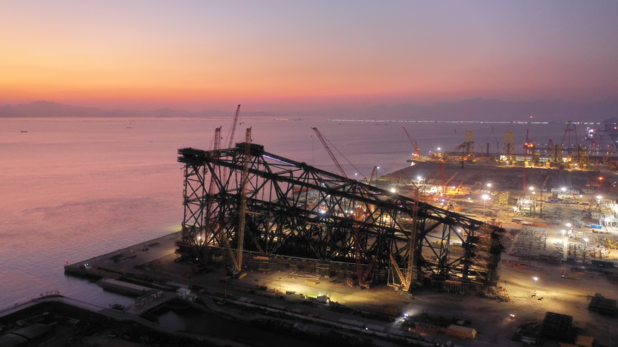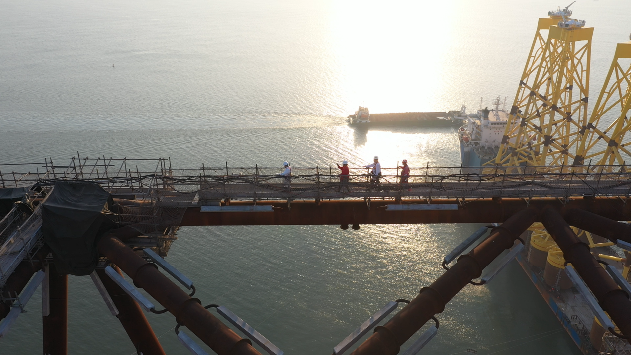 “海基一号”位于台风多发区域,海况恶劣、风浪和内波流巨大,且面临大型可移动沙波沙脊等世界级海洋工程难题。“中国海油统筹国内外优质资源,组织开展技术攻关,创新性提出300米级深水导管架设计建造方案,并攻克超大型导管架总体设计、大尺寸大跨度大吨位结构物多台吊机联合吊装、超大型结构物尺寸控制等一系列技术难题,填补了国内超大型深水导管架设计建造的多项技术空白,完善了导管架设计建造的技术和管理体系,同时首次应用数字孪生健康管理技术,为导管架安全运维提供坚强保障。”陆丰油田群区域工程总包项目经理阳连丰介绍说。