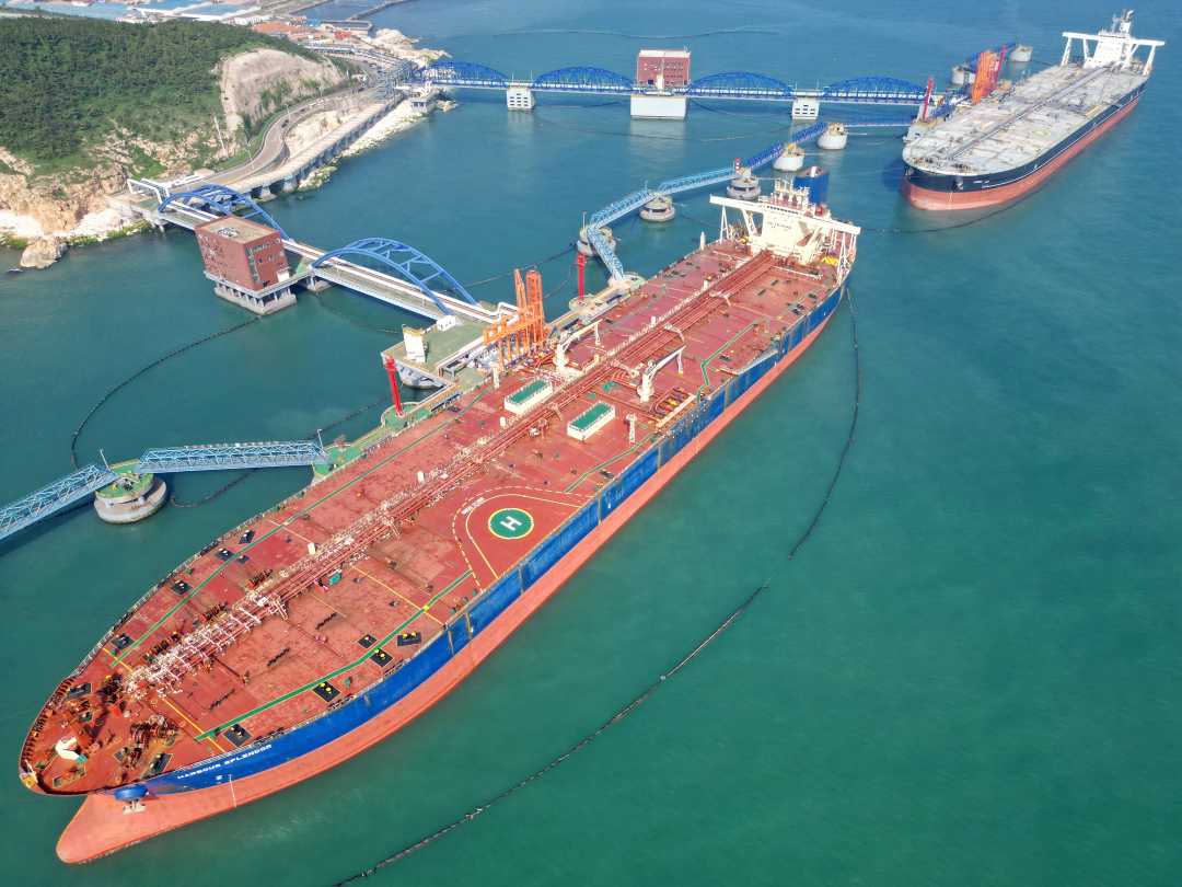 7月9日,两艘大型油轮在山东港口烟台港30万吨级原油码头卸船。