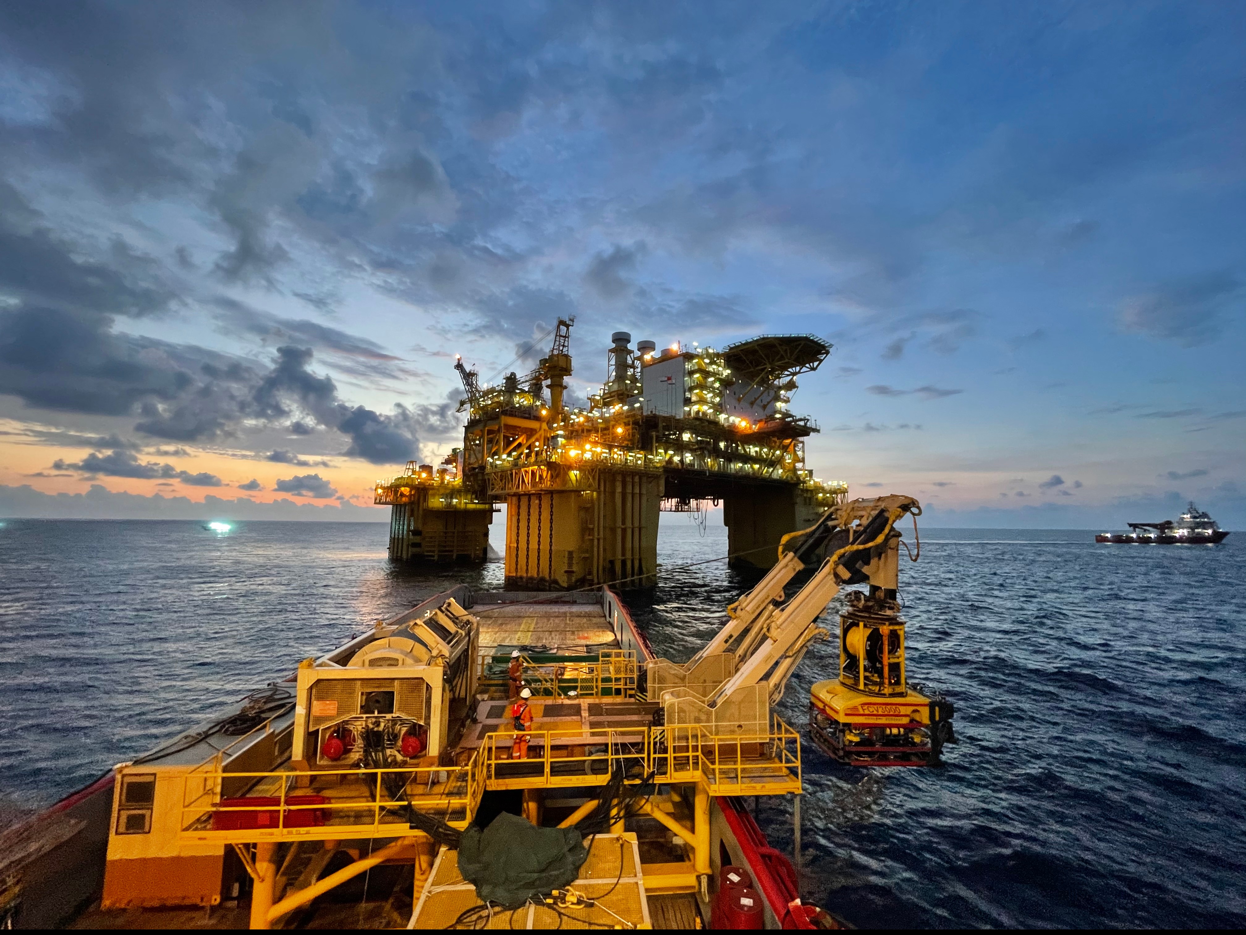 作业支持船在“深海一号”能源站附近提前下放ROV(水下机器人),用于导通海底管线流程。