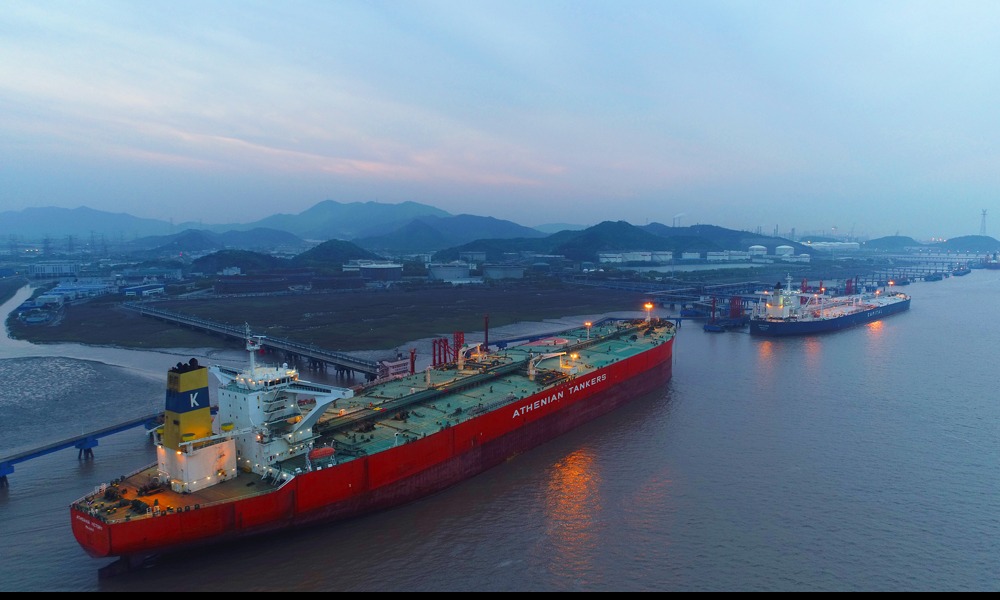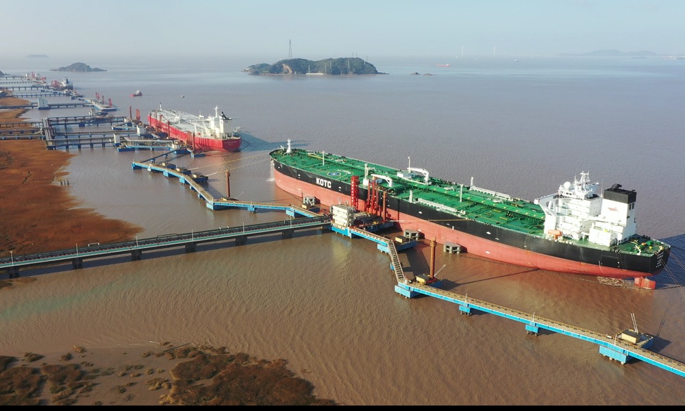 算山码头是中国石化旗下镇海炼化自备原油码头,主要接卸来自“一带一路”共建国家的原油,十年来,该码头累计接卸原油超过两亿吨。黄海鹰摄