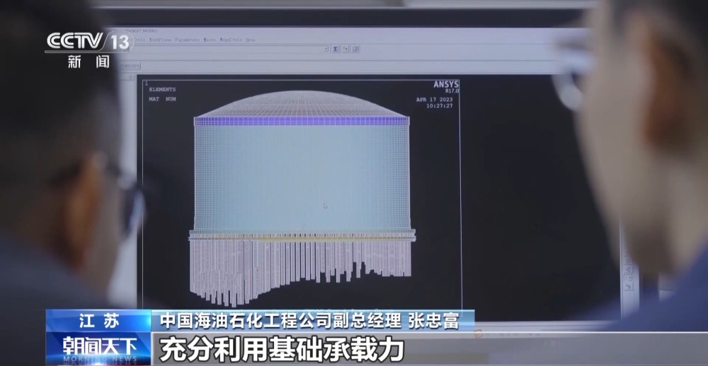 中国海油石化工程公司副总经理 张忠富:设计团队创新开发了新型的群桩承载力计算方法,充分利用基础承载力,建造团队首次采用一体化成桩技术,让超大型储罐能够立得住、站得稳。