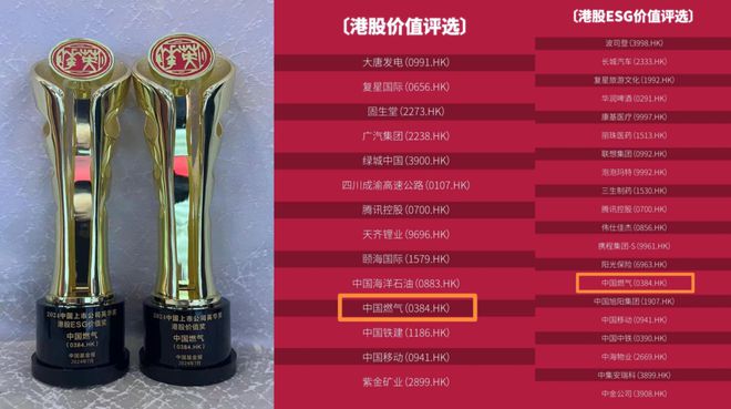 7月10日,由中国基金报主办的2024中国资本市场发展论坛暨上市公司论坛在上海举行,大会同步揭晓了2024中国上市公司“英华奖”评选结果,中国燃气控股有限公司(下称“中国燃气”或“集团”,00384.HK)荣膺“港股价值奖”和“港股ESG价值奖”两项大奖。