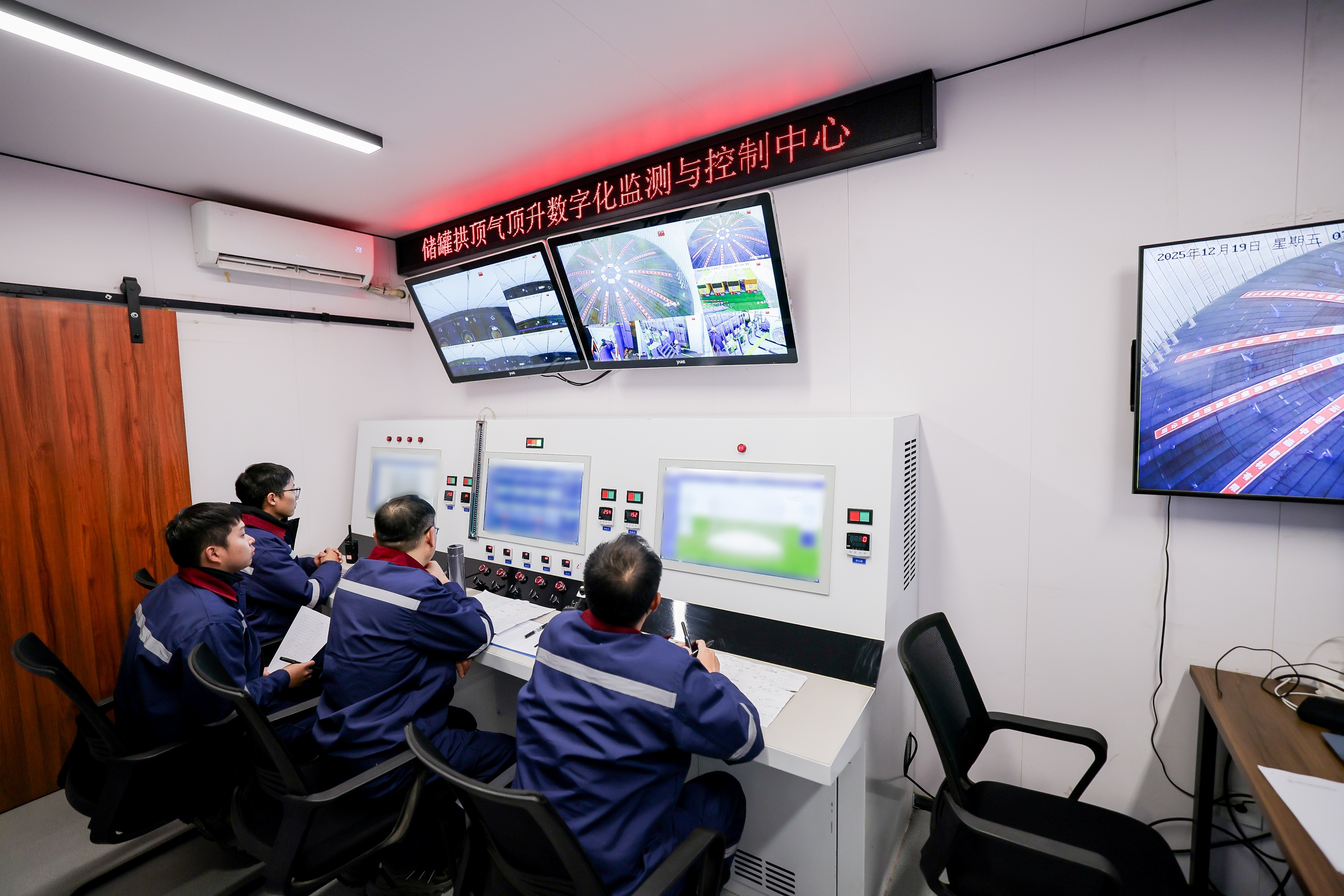 “要把这个面积相当于1座足球场,重量相当于近700辆家用轿车的钢铁帽子,稳稳戴到50余米高储罐上,靠的是自主研发的气压顶升技术。”中核五公司项目经理胡克梧介绍,“可以形象比喻为吹气球,通过4台大功率专用风机持续输出稳定气流,用气压把近千吨的大家伙顶至高空,最终实现毫米级精准就位。”