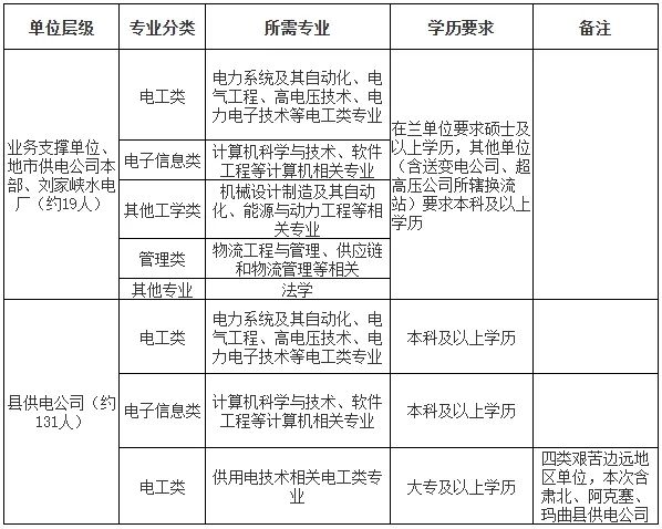 招聘专业指主修专业(不包含辅修专业)。招聘专业主要为电⼯类专业,少量招聘⾮电⼯类专业。根据2024年第⼀批招聘毕业⽣流失情况,进⾏少量补招。最终招聘数量将根据上级单位核定情况相应调整,主要招聘计划如下: