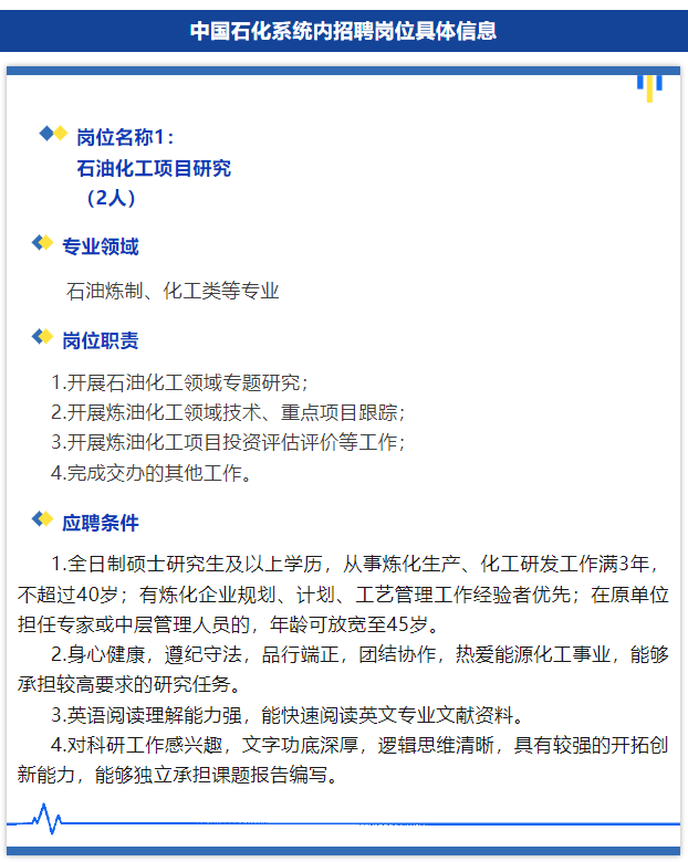 为努力扛稳“政府信赖的智囊团、集团倚重的参谋部、市场认可的思想库”职责,加快打造“世界一流能源化工高端智库”,夯实高质量发展的人才基础,拟通过社会公开招聘、中国石化系统内优化配置等渠道引进18名具有丰富实践经验和较高业务水平的成熟人才以及2名博士后研究人员。