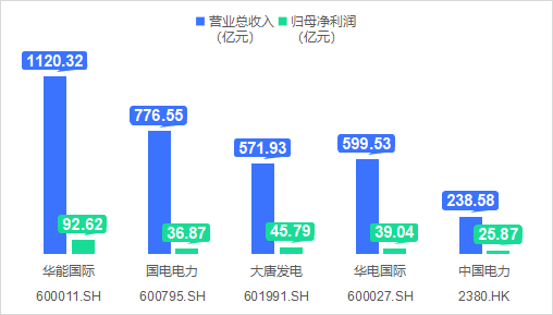 其中,华能国际以营收1120.32亿元、归母净利润92.62亿元高居榜首,成为五大企业中唯一营收破千亿、盈利近百亿的上市公司。