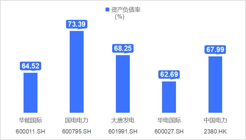 截至6月末,五大电力上市公司的资产负债率整体在62%~75%之间,处于行业中游偏上水平。就具体企业看,华能国际、华电国际资产负债率均稳定在65%以下,符合国资委要求。