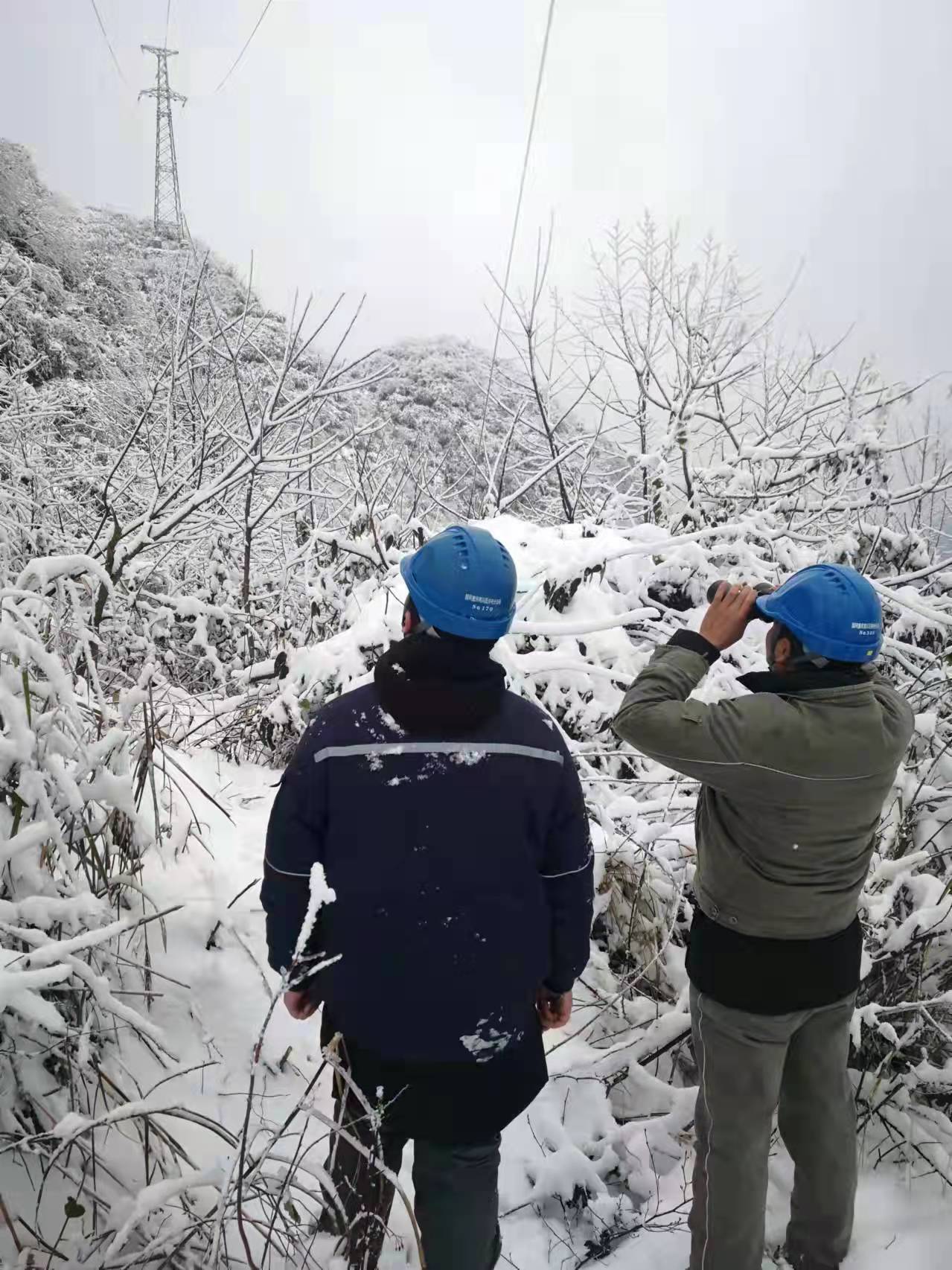 自春节至今,重庆市南川区受冷空气影响,气温持续走低,许多地区出现结冰暴雪恶劣天气。为了保证人们用电不受影响,温暖祥和地过好春节,南川供电公司检修公司输电运维班、各供电所一线员工放弃春节休息,全面开展线路巡查和检修。在此期间,大家背着应急抢险救援包、游标卡尺、无人机等装备,翻山越岭,对境内输电线路进行巡线、观测。2月7日,年后上班第一天,气温继续低下,迎来新一轮寒潮袭击,高海拔山区更是风雪交加,该公司巡线、检修工作一刻不敢放松,巡线人员每天反复确认各项电力线路的安全,开展了多次线路抢修任务。7日当天,该公司大观供电所在巡线中发现观白线、观兴线、黎太线、黎乾线四条线路,因大雪压断树竹,造成线路短路,同时发现瓷瓶绝缘子击穿等多个故障点。当即,该供电所全力组织人员进行抢修,抢修从7日凌晨0点开始,到深夜11点18分完成,历时近24小时,终于在风雪中恢复供电。同样,春节至今,该公司输电运维班分三个组,每天特巡冰雪线路11条。2月8日一早,输电运维班在德隆35千伏凤风线巡线,道路结冰积雪,巡线工人有的拿着望远镜、有的遥控无人机,聚精会神的巡视观察着线路。厚厚的积雪把道路两边的竹子压断倒在路面,大家蹲着或爬着通过,竹子上的雪落在脖子里,混合着汗水,“冰火相融”。大山巡线,很多路都是荆棘之路,巡线工也成了清理路障的一把好手,干干净净巡线去,归来已是“冰雪人”。