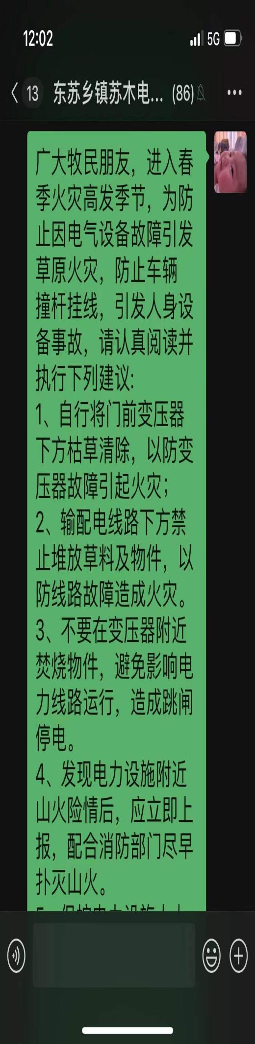 还积极与警务室沟通,制定《苏尼特左旗供电分公司森林草原输配电设施全过程防火工作管理实施方案(试行)》专项方案。由于苏尼特左旗输电线路途经全部为草原,故以林草区域为重点,通过微信群方式,开展特巡1次,快速有效地检查通道火患情况。同时深入牧户较多、草场较大的地段重点排查,对春耕烧荒、清明祭祀、废品存放等不安全行为和极易引发火灾事故的隐患问题,开展针对性防火宣传1次。