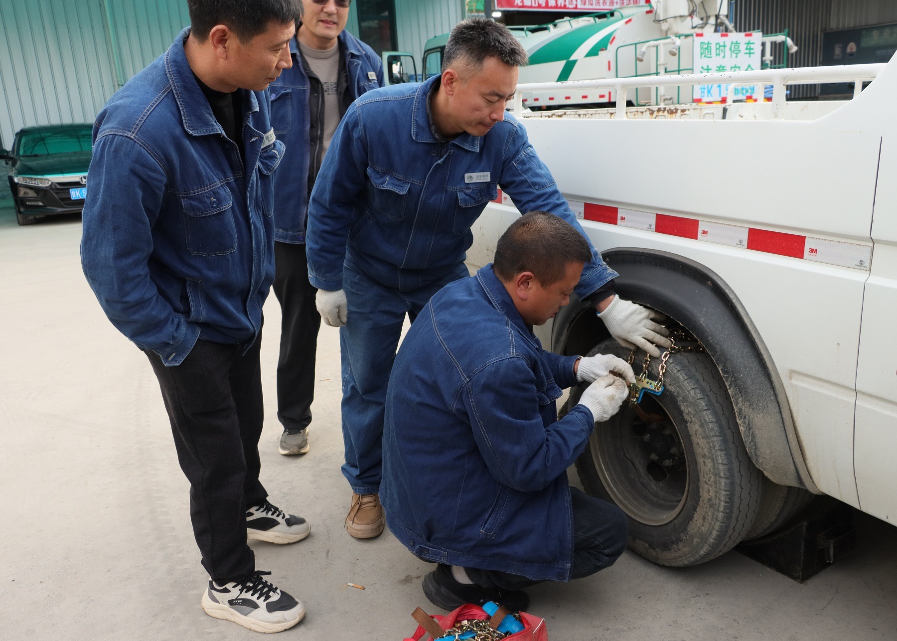 在应急处置演练板块,模拟车辆行驶途中突发故障、爆胎、冬季雨雪天气等场景,驾驶员们迅速响应,依照所学流程熟练更换轮胎、安装防滑链,有条不紊高效完成应急处置,进一步提升实战应急能力。