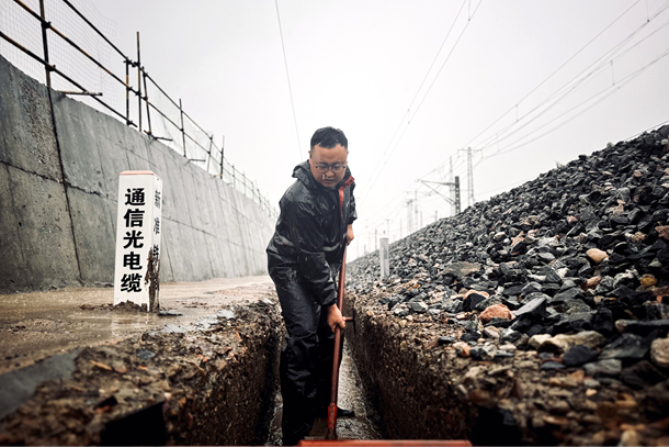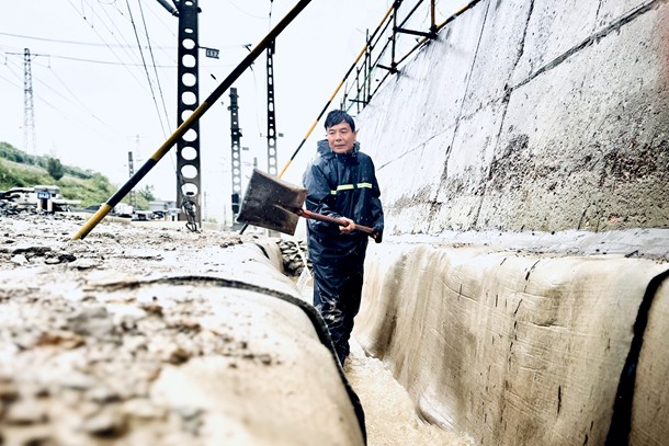 巡查至5号道岔附近下行线路一侧时,赵珺敏锐捕捉到了异常—排水沟边沿有两处发生了塌方,淤泥和石块严严实实地堵塞了沟渠。浑浊的雨水在沟内快速积聚,水位急速上涨,猛烈冲击着沟沿。险情迫在眉睫:一旦积水漫溢、浸泡甚至冲毁路基,将直接威胁到途经列车的运行安全。