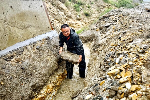 这一天中,每当雨势稍有减弱,奇志国和工友们便抓住这短暂的间隙,重新整理好装备,一次次踏入风雨中。巡查中,他们发现多处天沟、吊沟的出水口边缘被湍急的水流硬生生冲开,形成大小不一的缺口。
