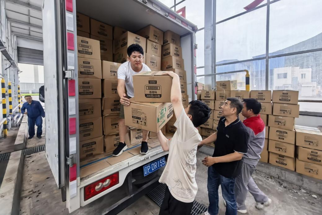青年突击队接卸救援物资。