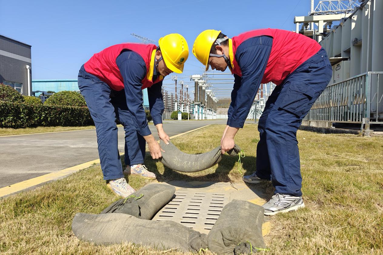 团林换流站运维人员符贵军和别征宇搬运沙袋封堵排污口。余有为 摄
