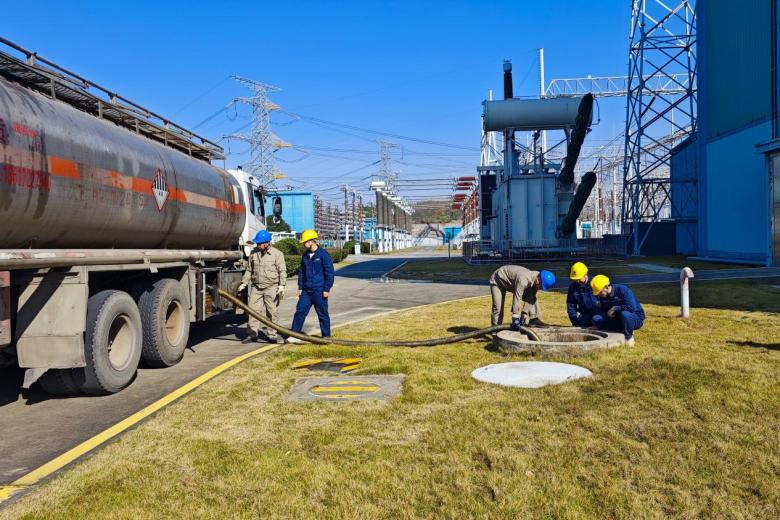 团林换流站运维人员联合运输公司抽排事故油池内油水混合物。崔瑜珈 摄