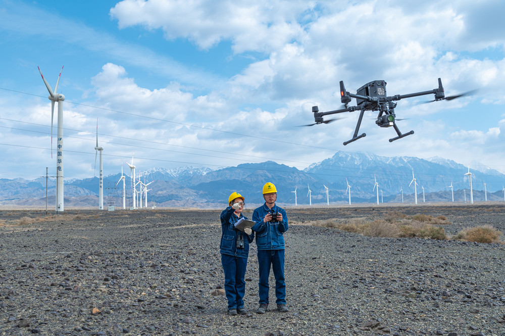 6月27日,迎峰度夏期间,国网乌鲁木齐供电公司输电运检中心工作人员在达坂城片区用无人机特巡220千伏输电线路,保障当地风电企业清洁能源可靠发电上网。(王晋魁摄)