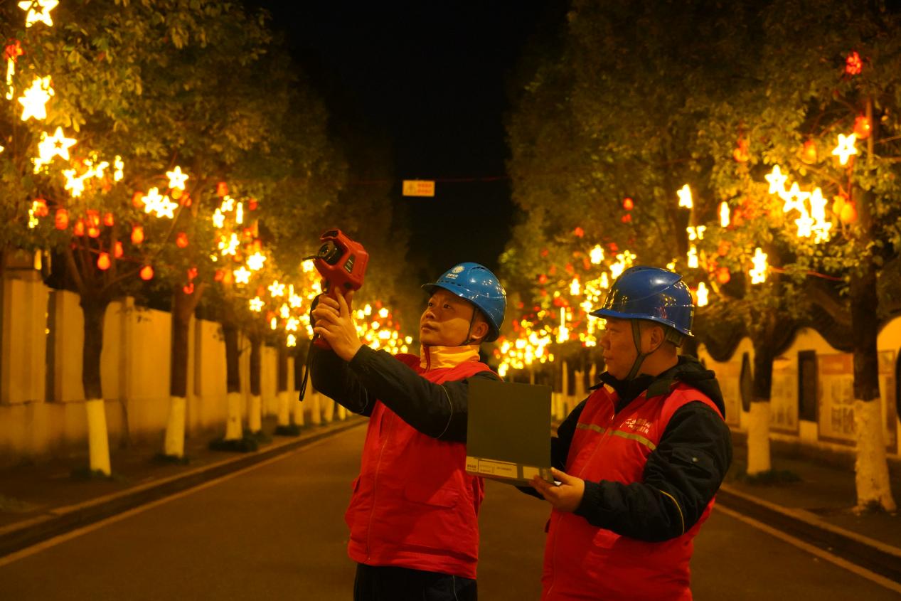 图为国网重庆开州供电公司员工在开州举子园景区,对10千伏线路开展节前保电夜巡。