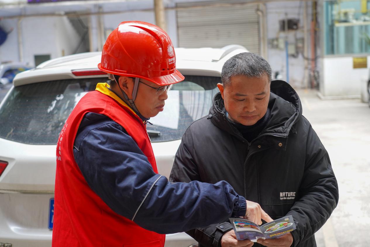 图为国网重庆开州供电公司员工在盘龙苑小区,向客户讲解安全用电知识。
