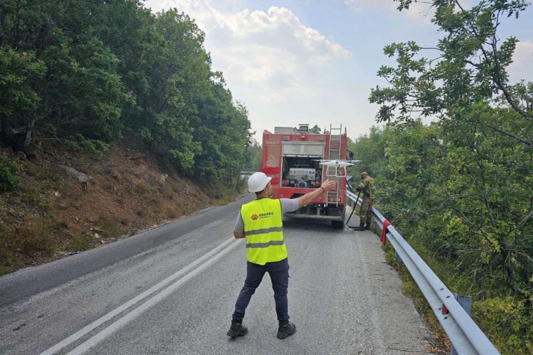 图为欧洲公司员工正在使用无人机勘察火情