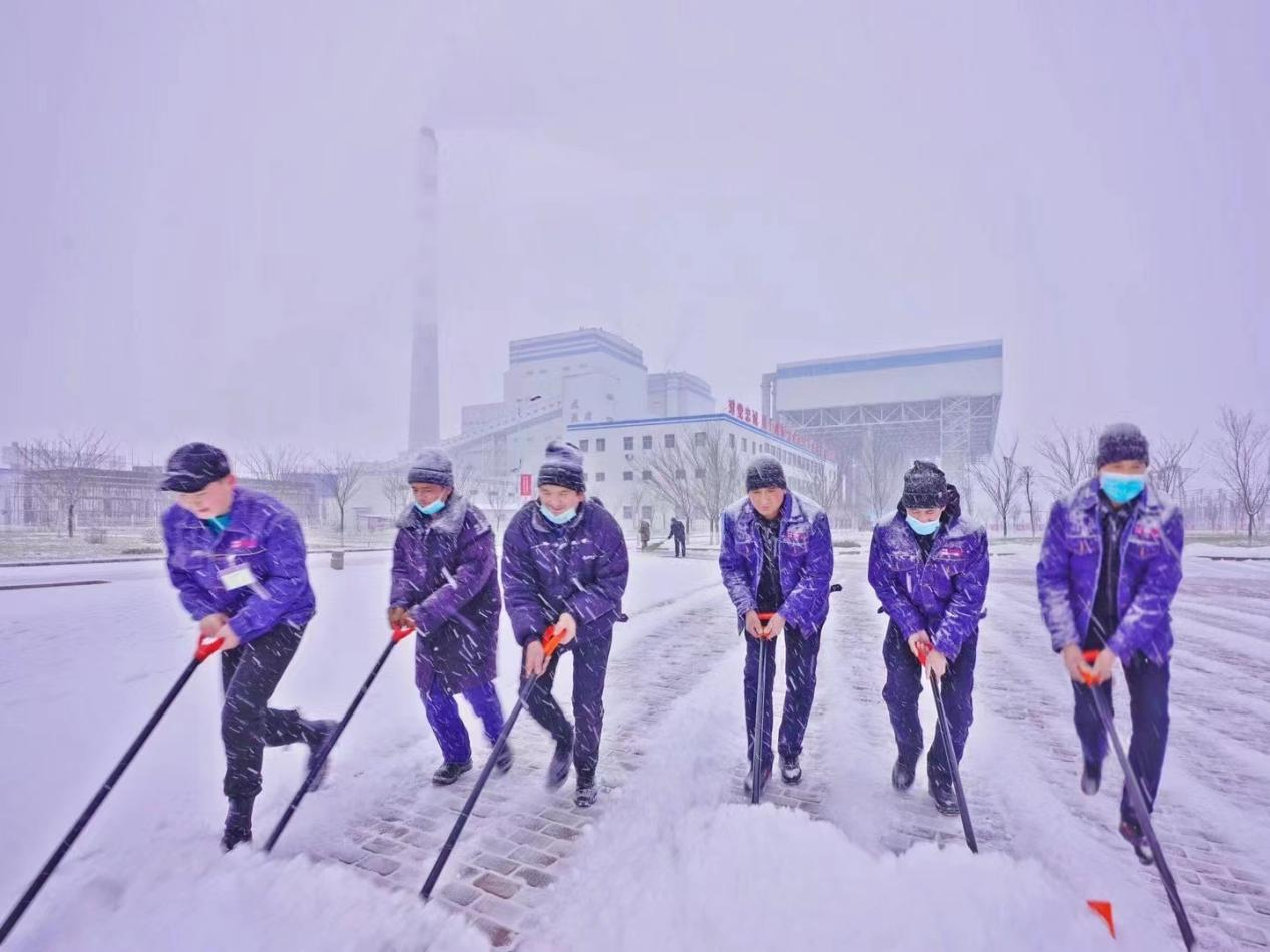 近日,新疆地区出现“断崖式”降温,国神和丰煤电公司第一时间启动应急预警机制,严格执行24小时领导干部值班和信息报送制度。图为电厂职工组团清雪。
