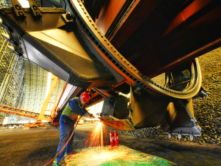 图为国神府谷电厂燃料检修人员对斗轮机铲斗进行校正。