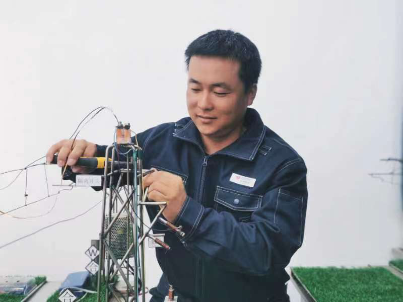 图为张旭升正在进行接触网模型制作