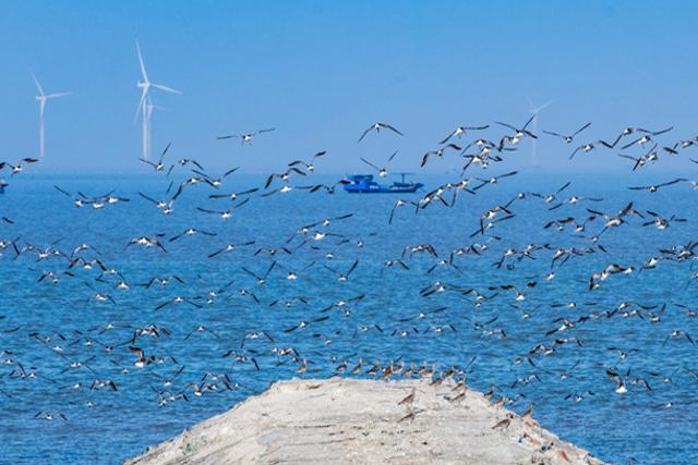 在江苏省如东县沿海,成群结队的鸟儿和鳞次栉比的风机交相辉映,无不展现着“人与自然和谐共生”的美好生态画卷。这,是龙源电力深耕海上风电开发、落实海洋经济战略以来,坚持科学用海、规范用海,让海上风电建设与生物多样性保护系列研究相结合,实现经济效益、社会效益和生态效益最佳结合的缩影。