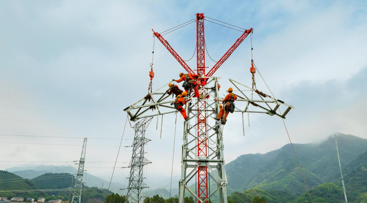 在铁塔组装方面,大有集团电建公司派出“智能铁军”,应用履带式智能组塔装置,通过智能化控制系统遥控操作吊装预拼装塔材,组装铁塔如高空“搭积木”,显著缩短单基铁塔组立时间,有效提升施工效率、减少高空作业人员投入并降低安全风险。设计之初,该项目涉及到的砍树区域位于环水保限制区域,在前期踏勘时,大有集团电建公司提前与水利、林业部门及属地运检公司沟通,结合实际情况进行优化,在减少砍伐的同时避开一级水源保护区,用“绿色施工”守护生态基底。