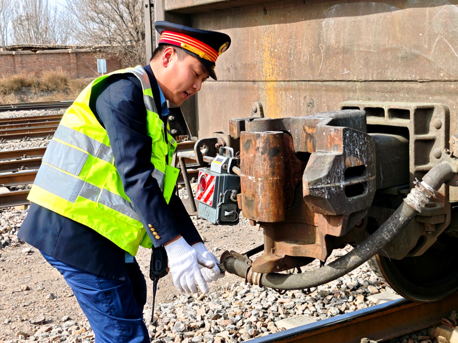 寒夜的股道上,钢轨在灯光下泛着冷光,检车员的身影在列车旁穿梭。“大沙沟列检是疆煤进宁的第一道安全关口,容不得半点马虎。”张泽介绍,每一趟列车进站,3名检车员会分段检查,一人负责一节,绕车检查一圈至少50分钟,加上往返股道的15分钟,一趟作业下来,队员们要在寒风中作业一个多小时。检查的重点聚焦“五防”,车钩连挂是否牢固、转向架的车轮与侧架有无隐患、基础制动装置的杠杆上拉杆与开口销是否完好,还有车辆装载加固状态、车体是否倾斜外胀,每一个细节都要反复确认。“最近一晚最多要检查八趟列车,光往返走路就将近20公里,有时手冻僵了,就哈口气暖一暖继续干,作业不能停。”张泽说道。