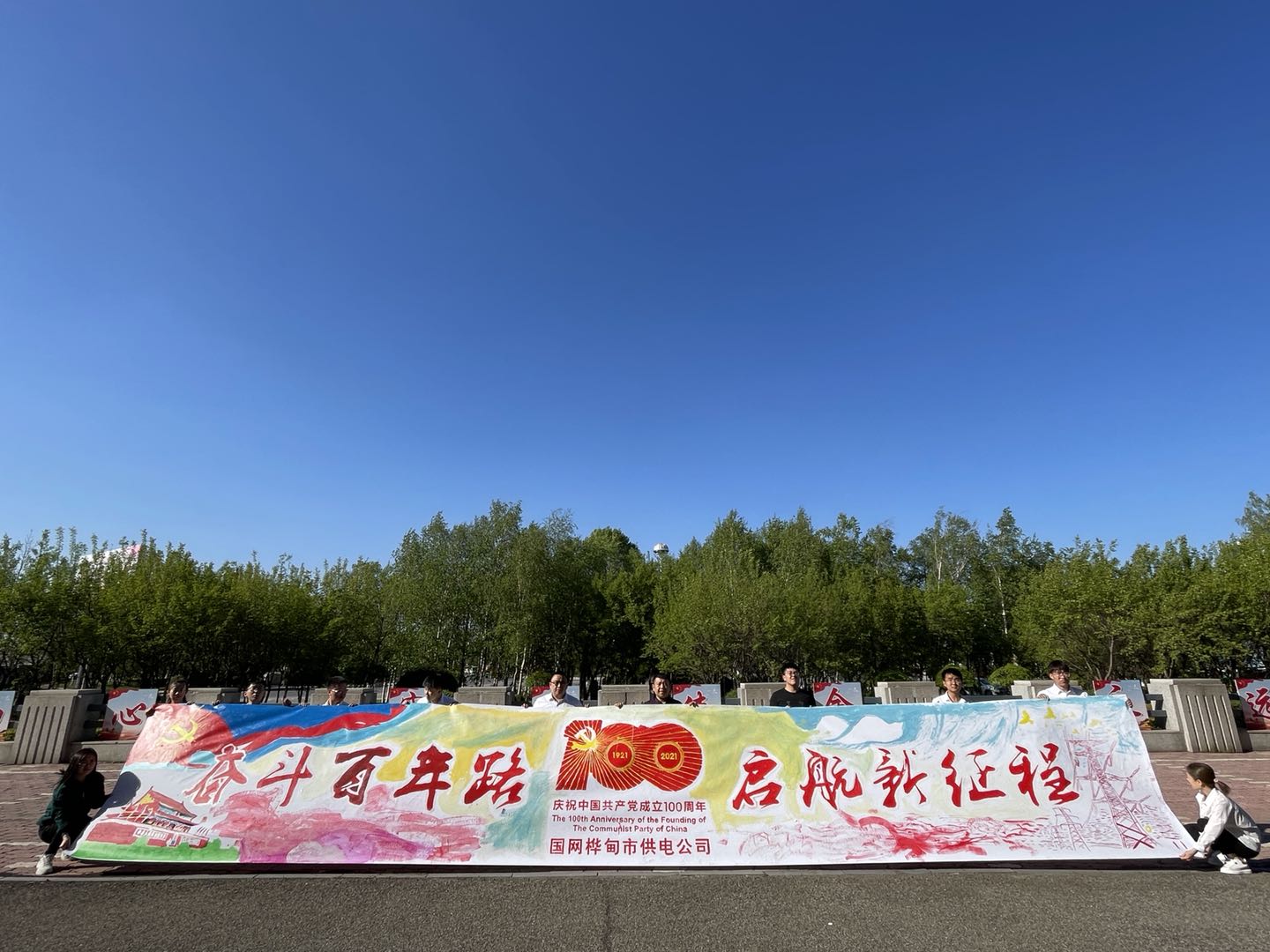 以天安门城楼、党旗、党徽、建党百年庆祝活动标识为主要元素,以蓝天、白云、和平鸽以及高压铁塔等为背景,桦甸公司20余名党员和青年员工,共同绘制了这幅长10米、宽2米的巨画。“从空白的画卷到色彩斑斓,致敬我们党几经挫折而不断奋起,从无到有,从弱到强,从一个胜利走向另一个胜利,历经苦难而淬火成钢,100年风雨历程充满艰辛坎坷,历史凝聚着无数先辈的智慧和力量”,桦甸供电公司党委书记在活动开幕中希望青年员工在绘画时多体会此次活动的重要意义。