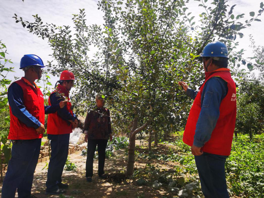 一场秋雨后,山里的空气无比清新,天空一碧如洗。山上连片的果园里,长势旺盛的苹果树显得格外青翠,硕大的苹果挂满枝头。施工人员正穿梭在苹果园有条不紊地更换下户线。
