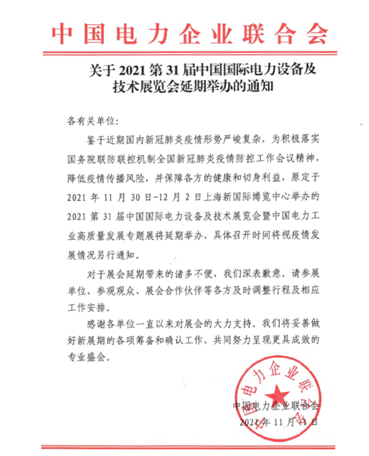 附件: 《关于2021第31届中国国际电力设备及技术展览会延期举办通知》