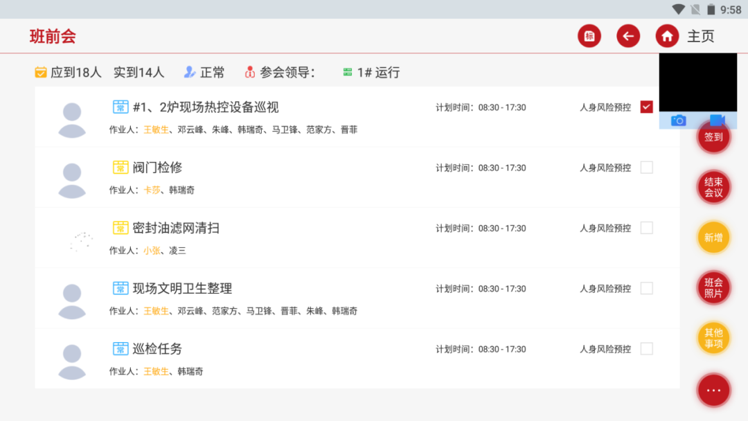 ◆ 召开班前班后会,协助班组长进行智能化工作任务安排,班组工作通过手机APP记录班前会、风险分析,反馈工作任务完成情况,工作任务有安排、有反馈、有落实。