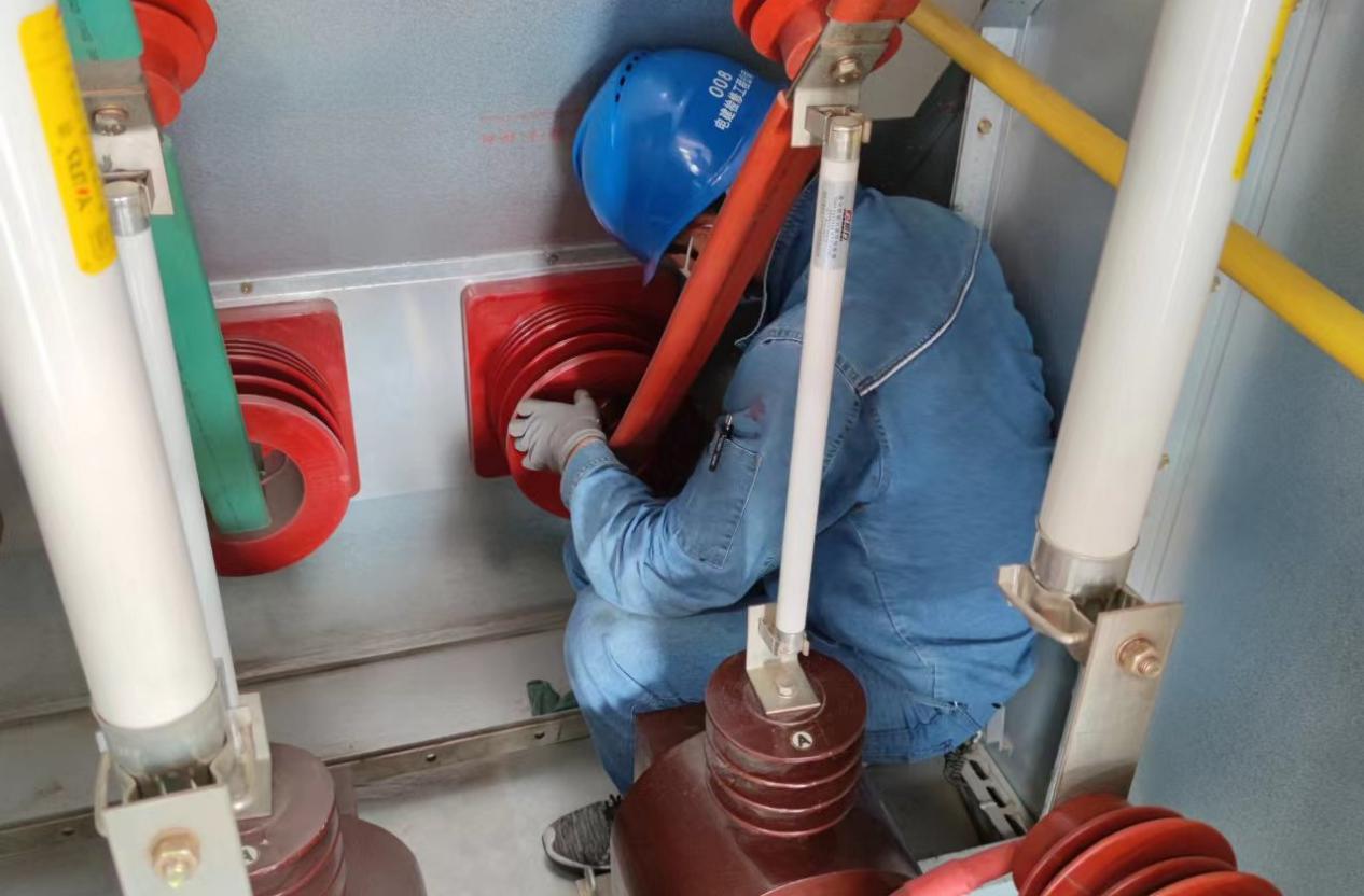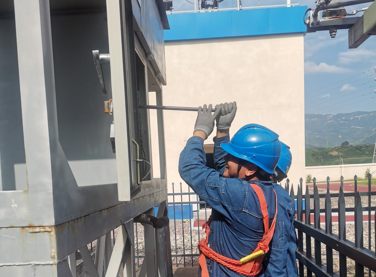 急难时刻见担当。在处置跨线电缆绝缘缺陷时,公司为了尽早查找到故障点,紧急从成都调用了电缆故障测试仪。在35摄氏度的夜间环境下顶着照明探灯的烘烤开展电缆熔接作业。为了消除户外隔离开关接触电阻偏大的问题,他们又冒着骄阳烈焰全副武装开展登高作业,对“摸着烫手”的户外隔离开关触头接触面进行打磨,以降低其接触电阻,确保接触良好。