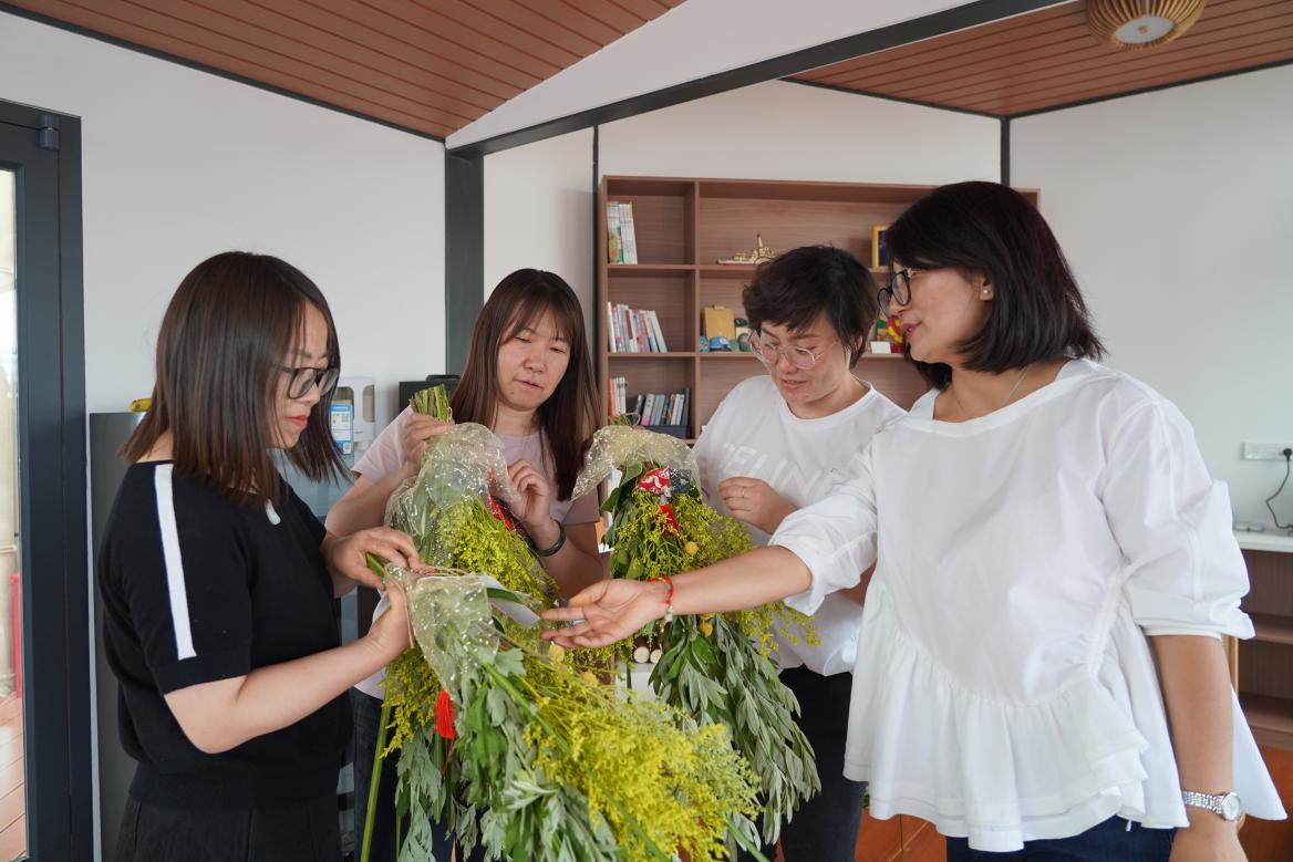 “菖蒲,本来就是正义的象征,它被诗人称作‘蒲剑’,寓意对楚怀王及一切恶势力充满着无比的仇恨;而艾蒿表达挚爱之情,自然是爱戴那位行吟江畔、忧国为民的伟大诗人了……”综合管理部的党员康改霞一边演示和讲解如何绑扎端午花束,一边介绍不同花材传递的历史故事,让大家了解千姿百态的花草世界,提升了对插花这一传统技艺的兴趣。