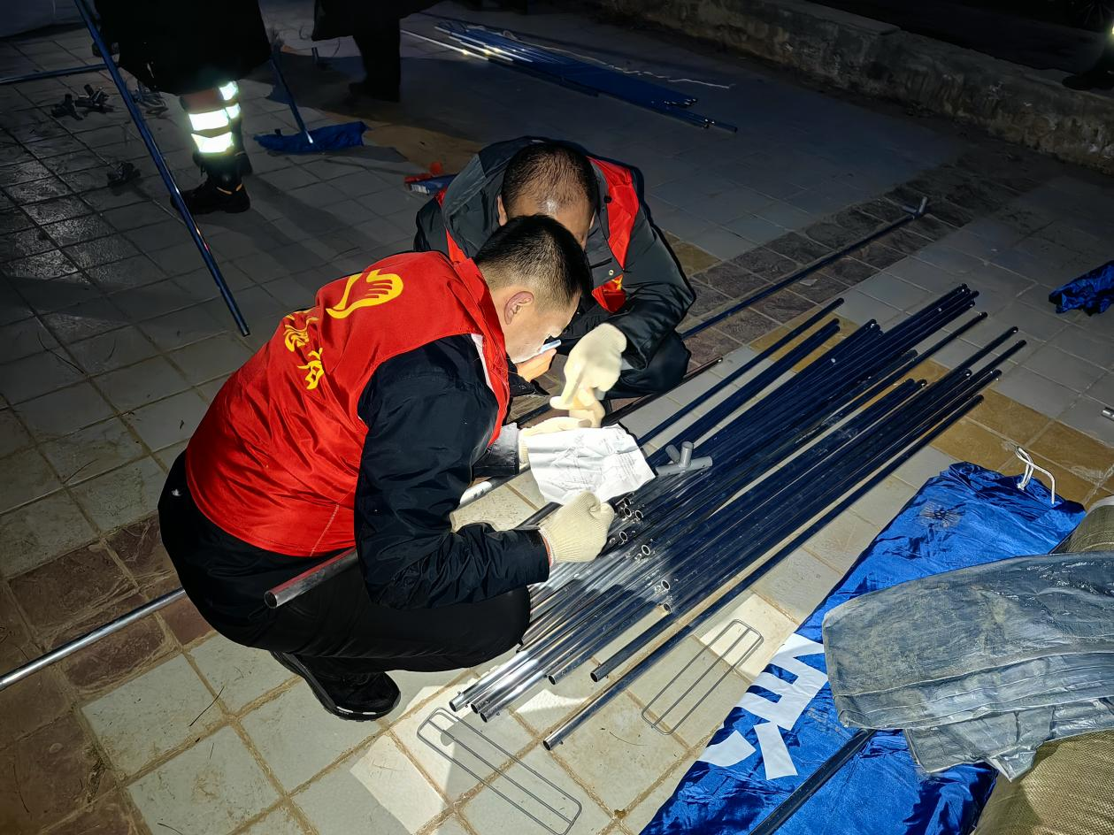 图为救援人员连夜组装应急帐篷确保群众温暖过夜